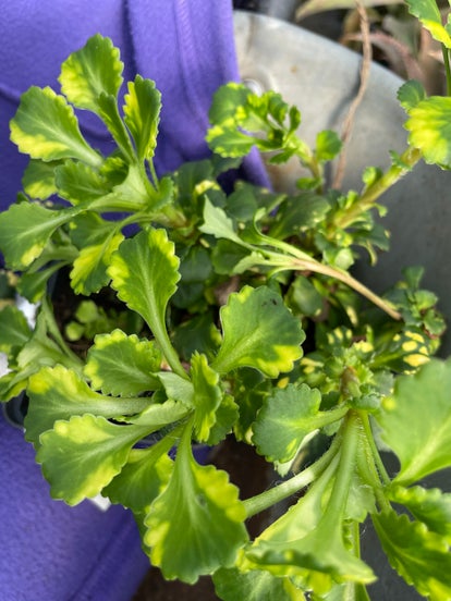 An evergreen, variegated perennial with green and yellow-splashed, spoon-shaped leaves arranged in rosettes forming a low, spreading mat. Tiny star-shaped, pink-flushed white flowers are borne on slender, branched stems up to 30cm tall in spring and summer.