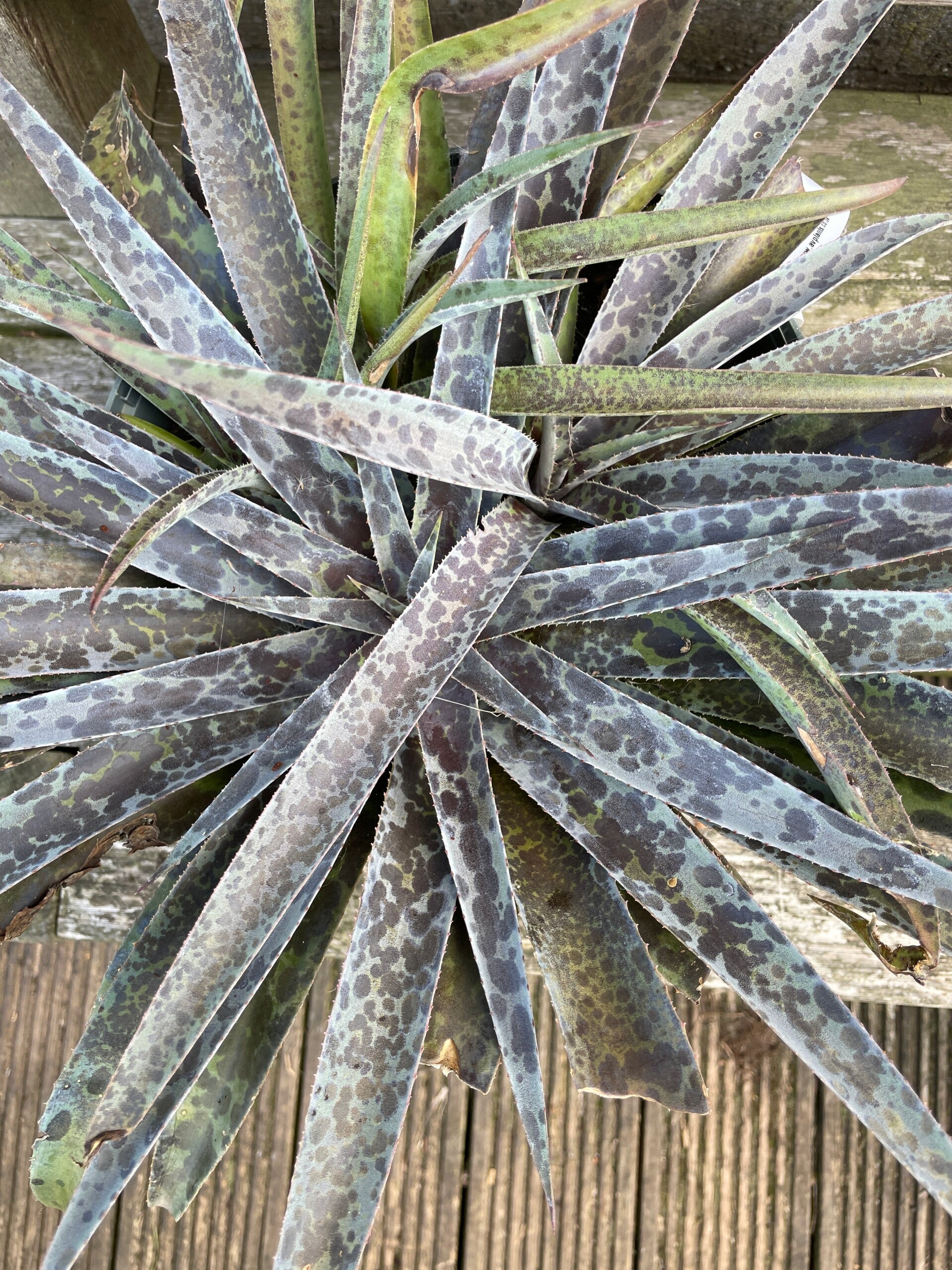Mangave 'Moonglow' is a unique, man-made hybrid succulent plant resulting from a cross between Agave and Manfreda. It features architectural, silvery-blue, fleshy leaves with contrasting dark purple flecks and spots, forming a tight rosette. 'Moonglow' combines the fast-growing, architectural qualities and unique patterns of Manfreda with the refined form of Agave, offering a plant that is hardier, grows faster, and has softer marginal spines than a traditional Agave. It thrives in full sun and requires free-draining soil and protection from winter frost to prevent root rot.