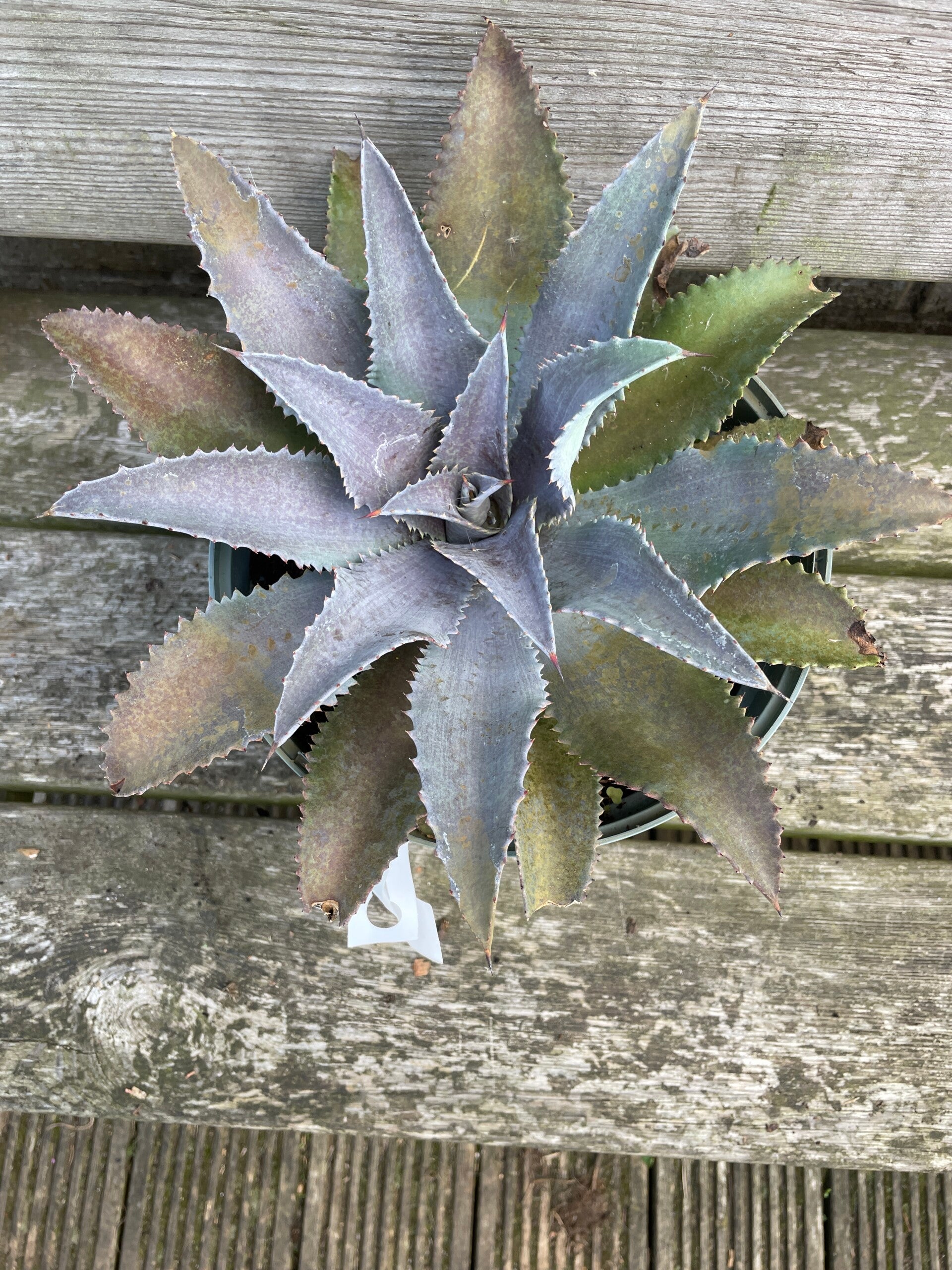 Bold and chunky, dazzlingly silver and fierce looking, its broad leaves have a strong agave character, revealing its hybrid parentage. Although fierce-looking, the leaves are quite soft and flexible, making the imposing hooked spines on its leaf margins relatively harmless. One of the larger False Agaves, it slowly produces pups (young offshoot rosettes), making a clump that regularly produces 2m tall spikes of bright yellow flowers. Worth trying outside in the hottest most sheltered spots in southern and coastal gardens, or returning to an unheated conservatory or greenhouse for winter.