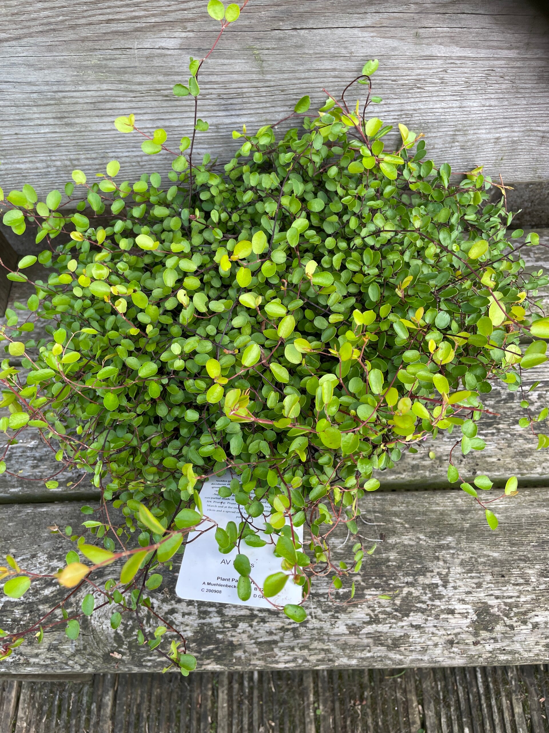 Muehlenbeckia complexa 'Golden Girl' is a semi-evergreen twining vine or ground cover, commonly known as creeping wire vine. It is known for its dense mass of thin, wiry stems and golden-yellow foliage that matures to a glossy yellow-green. The plant is hardy, drought and wind-resistant, and adaptable to many different locations.