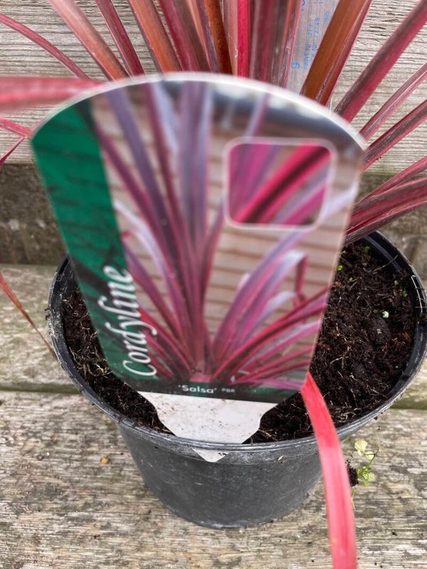 - Foliage: The striking foliage is the main feature of the 'Salsa' cordyline. The broad, sword-like leaves are a deep reddish-purple with bright, pink margins. This combination creates a "firework" of color.
