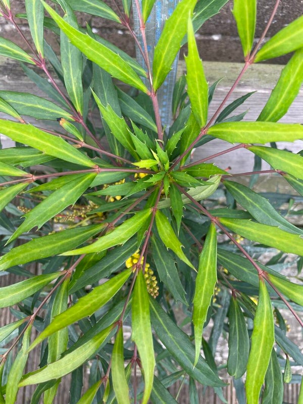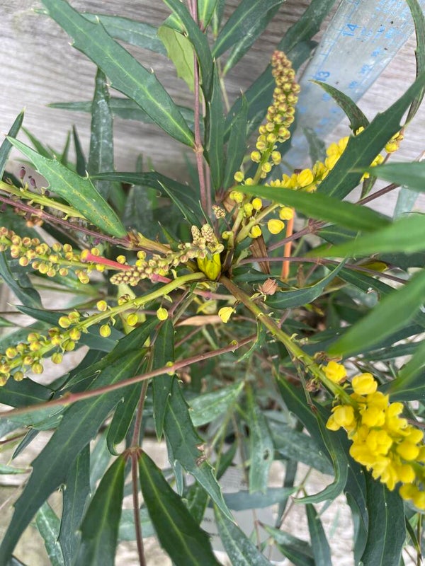 - Foliage: The evergreen, dark green leaves are narrow, deeply divided, and spineless, a contrast to many other mahonia varieties. They emerge with a metallic bronze tint in spring before maturing to a darker green.