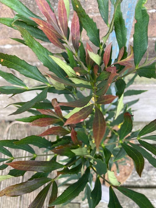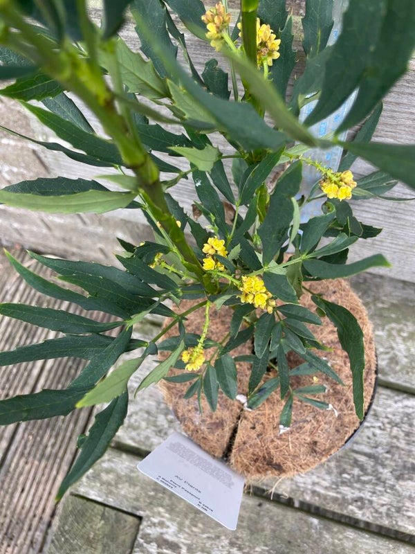 The Chinese mahonia (Mahonia sinensis) is an evergreen shrub native to China, known for its elegant foliage, fragrant yellow flowers, and ornamental blue-black berries. It is well-suited for shaded garden areas and tolerates a range of soil types.