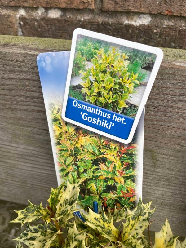 Osmanthus heterophyllus 'Goshiki', also known as variegated false holly or holly olive 'Goshiki', is a compact, slow-growing evergreen shrub prized for its striking, year-round variegated foliage. The name 'Goshiki' translates to "five colors" in Japanese, referring to the blend of colors found on its leaves.