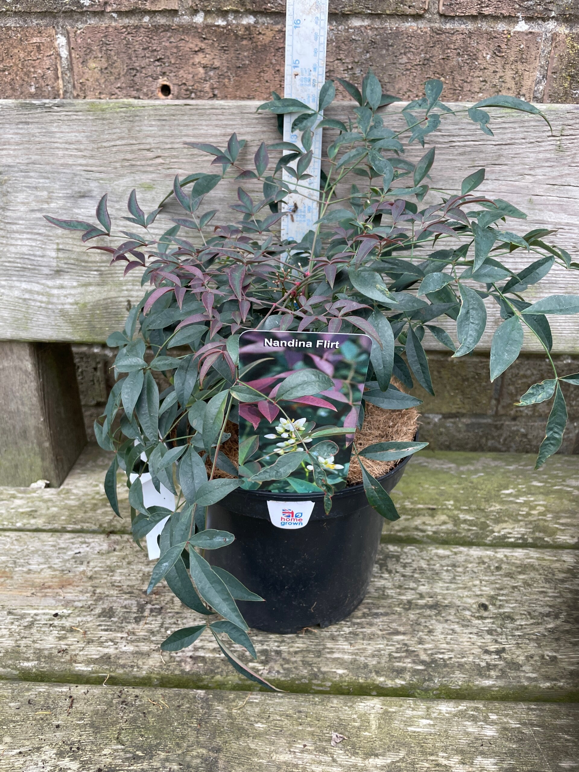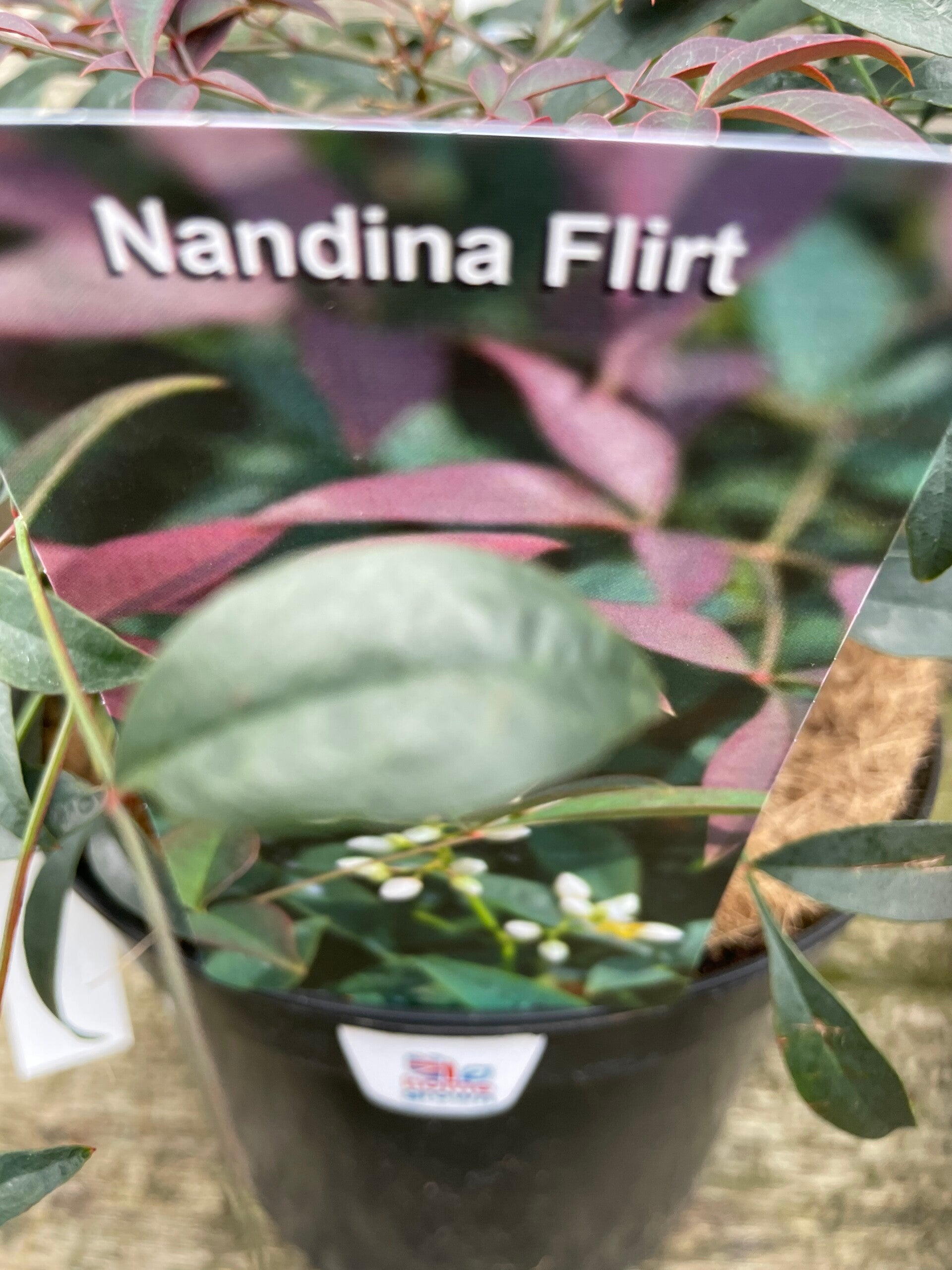- Foliage: The new leaves of the Nandina domestica 'Flirt' emerge in a deep wine-red colour in spring, intensifying to a brighter red in summer. The mature foliage is purple-green or deep green and provides excellent contrast.