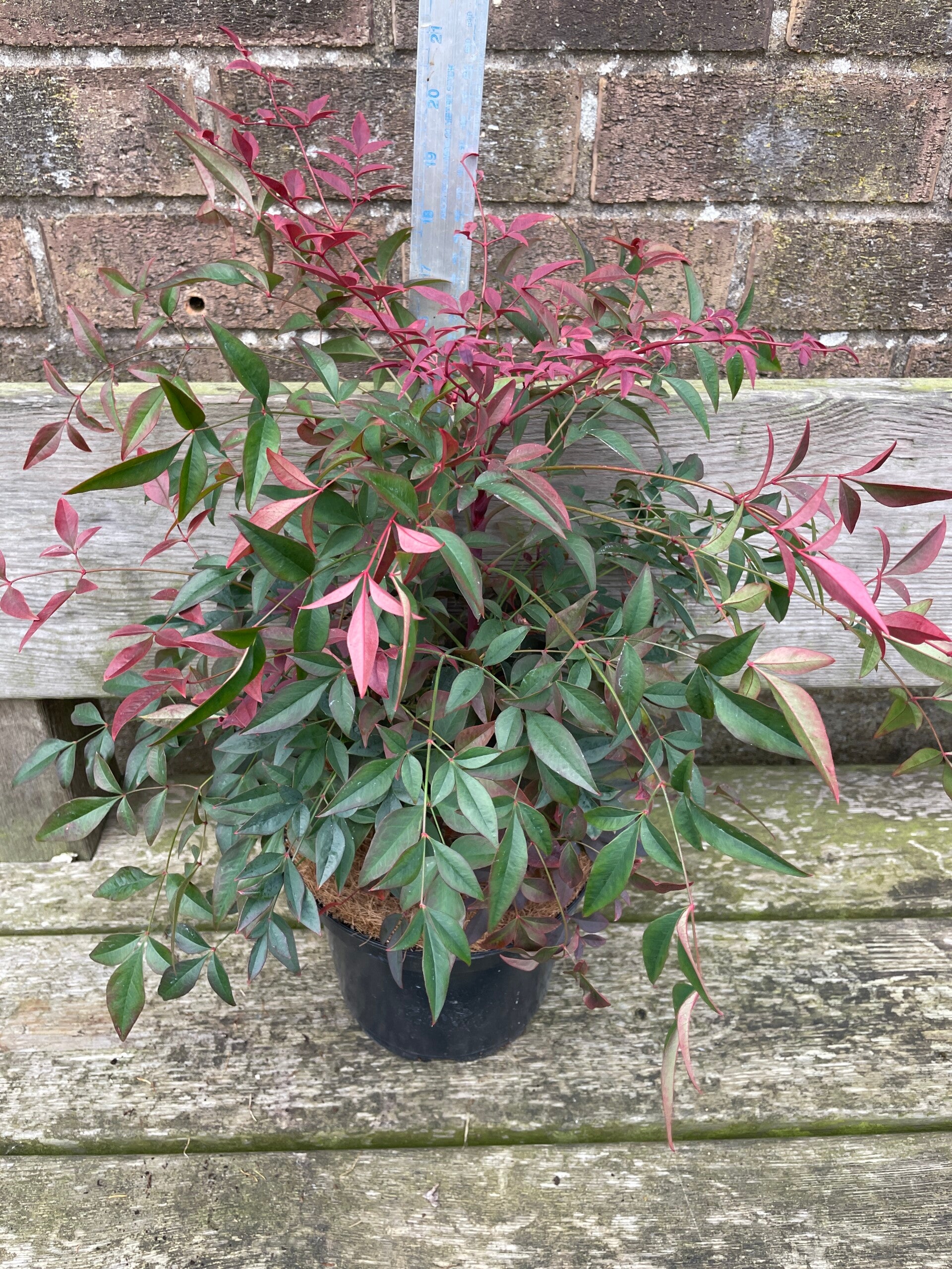 Nandina domestica 'Obsessed', also known as 'Seika', is a compact, evergreen shrub often called heavenly or sacred bamboo. It is prized for its vibrant red and green foliage that changes colour throughout the seasons. The cultivar name 'Seika' means "sacred fire," which refers to its fiery red new growth.