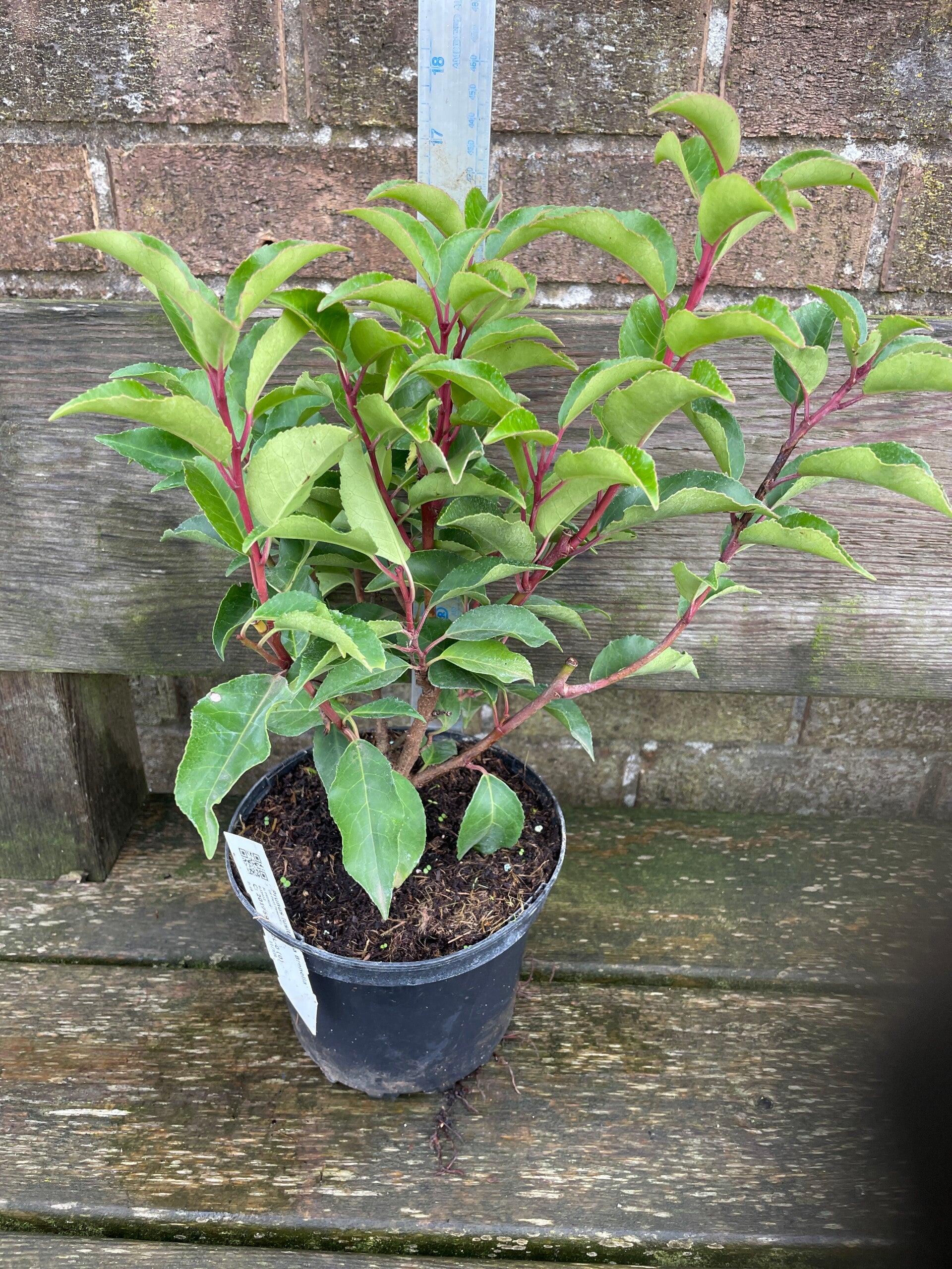 Foliage: The leaves are slender, oval-shaped, lustrous, and dark green, contrasting beautifully with the new shoots which have a distinctive pink or maroon hue. It is evergreen, providing year-round interest and screening.