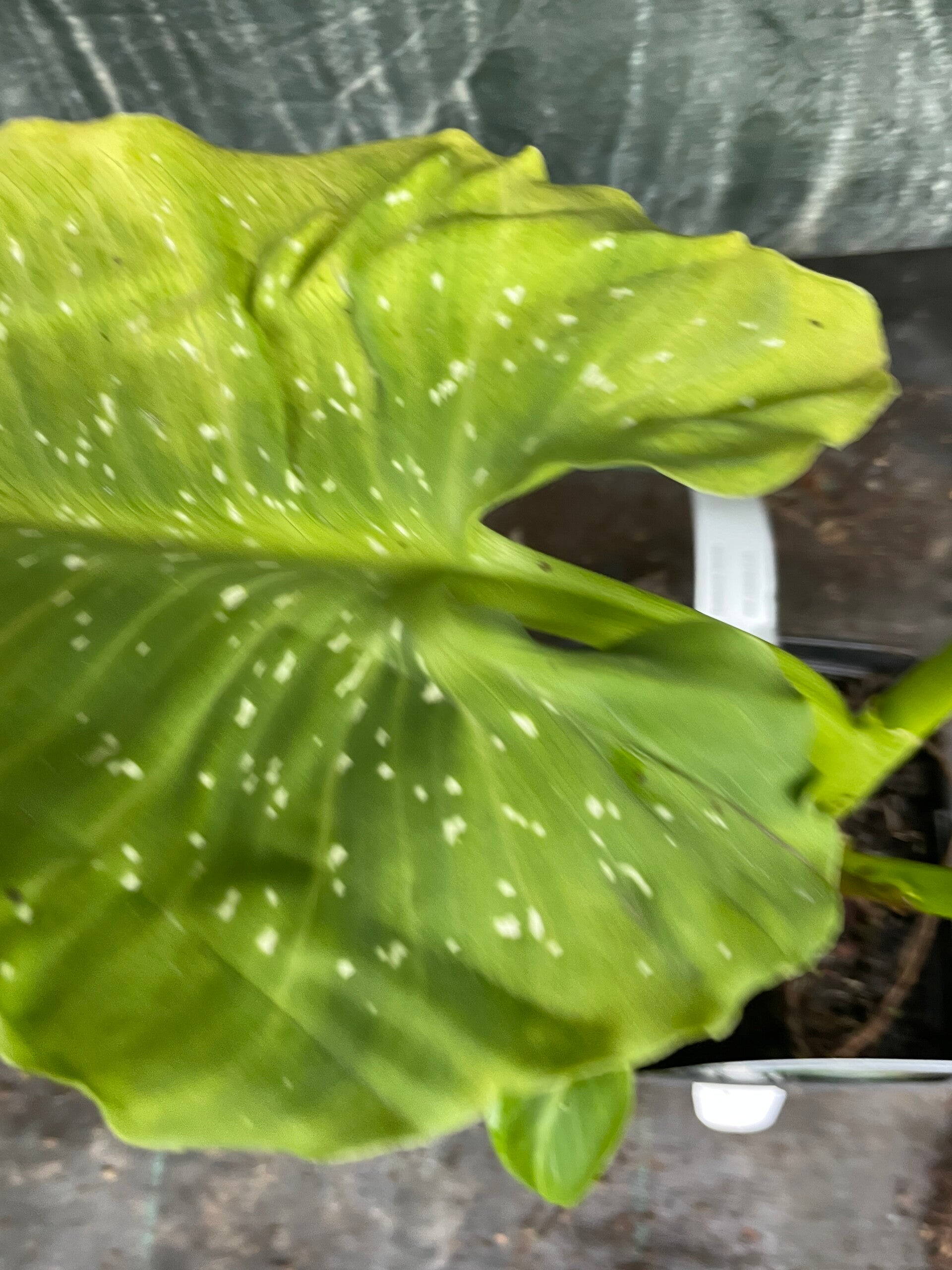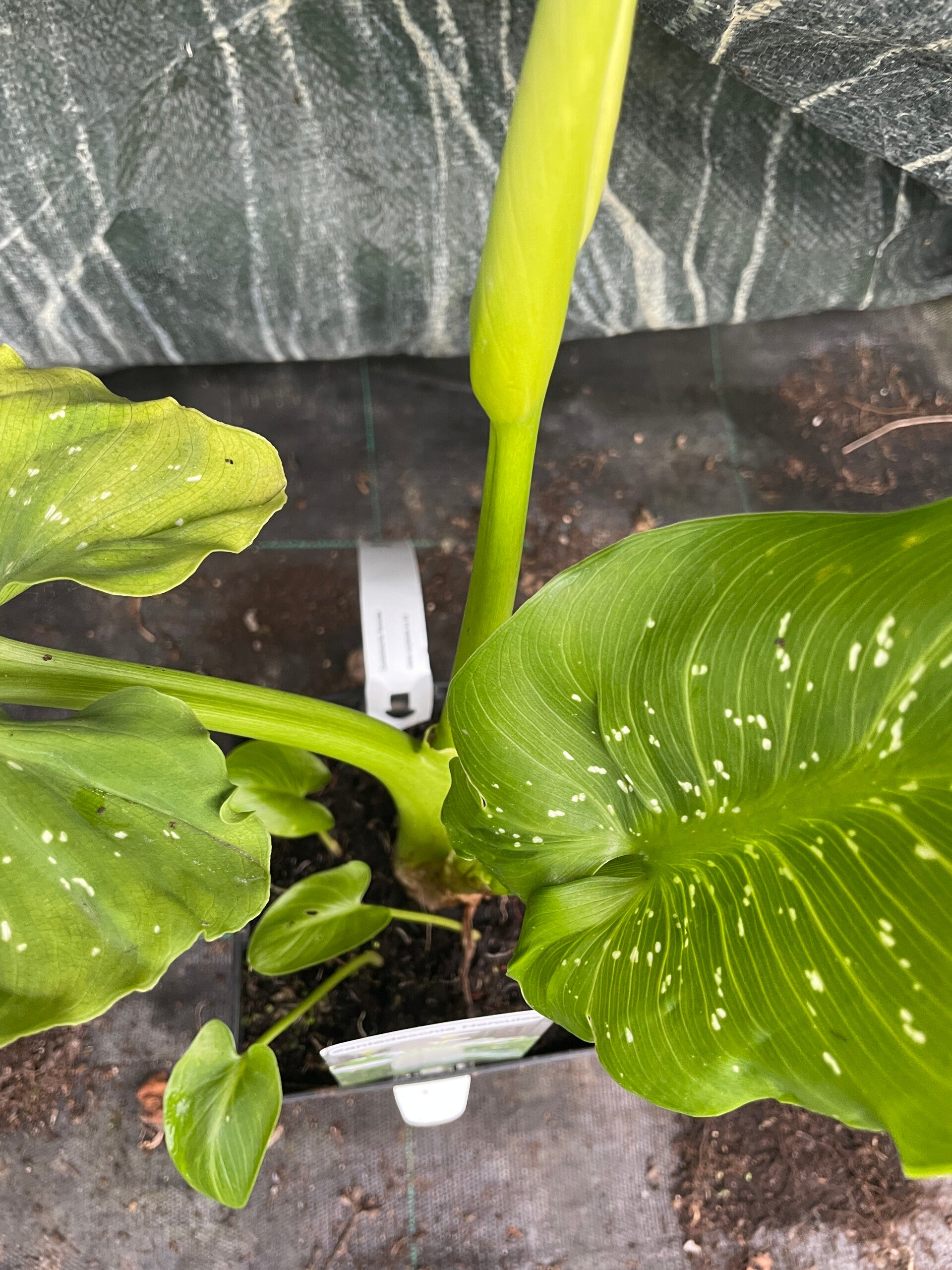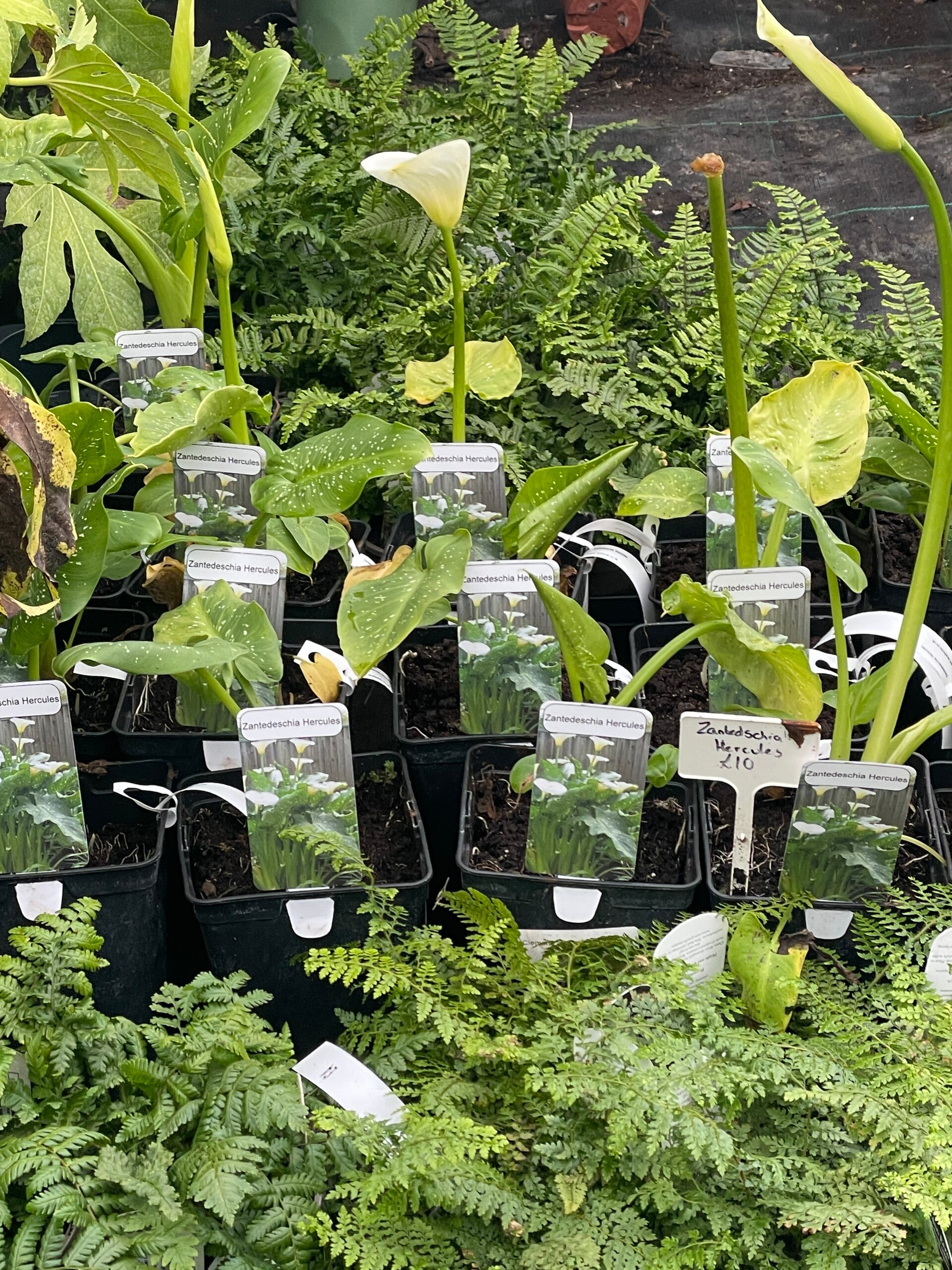 Zantedeschia ‘Hercules’, is a massive, architectural hybrid of the common Arum Lily. It is prized for its immense proportions, reaching heights of 1.5 to 2.5 metres (5–8 ft) under ideal conditions. Features huge, arrow-shaped, dark green leaves that are distinguished by their prominent white spots or silver "freckles". Leaves can reach up to 5 feet in length. Produces large, funnel-shaped, pure white spathes with a bright yellow central spadix. These blooms can be up to a foot across and often carry a faint, sweet scent.