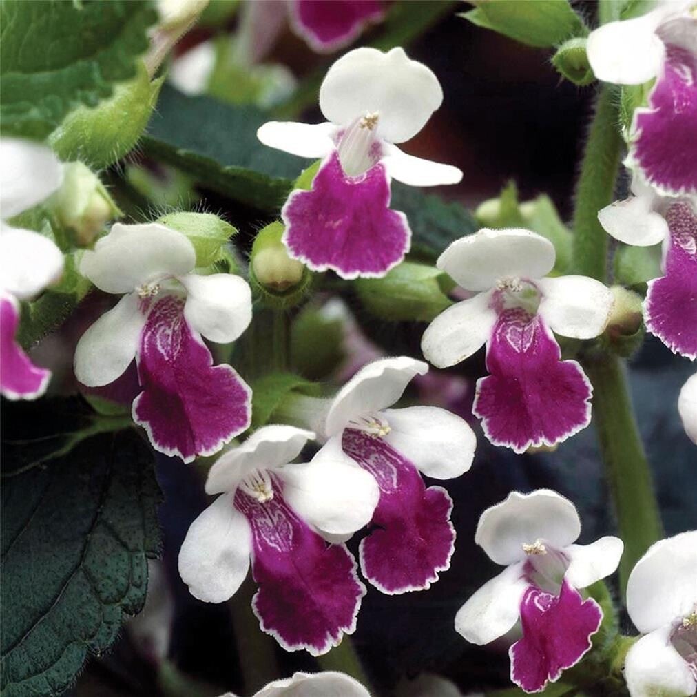 A compact, clump-forming perennial to 40cm tall and wide with oval or egg-shaped deeply-veined leaves with scalloped edges. Both the stems and leaves are covered with hairs and are honey scented. Small whorls of orchid-like flowers comprising a dark purple lower lip and white upper lip are borne in late spring and early summer.