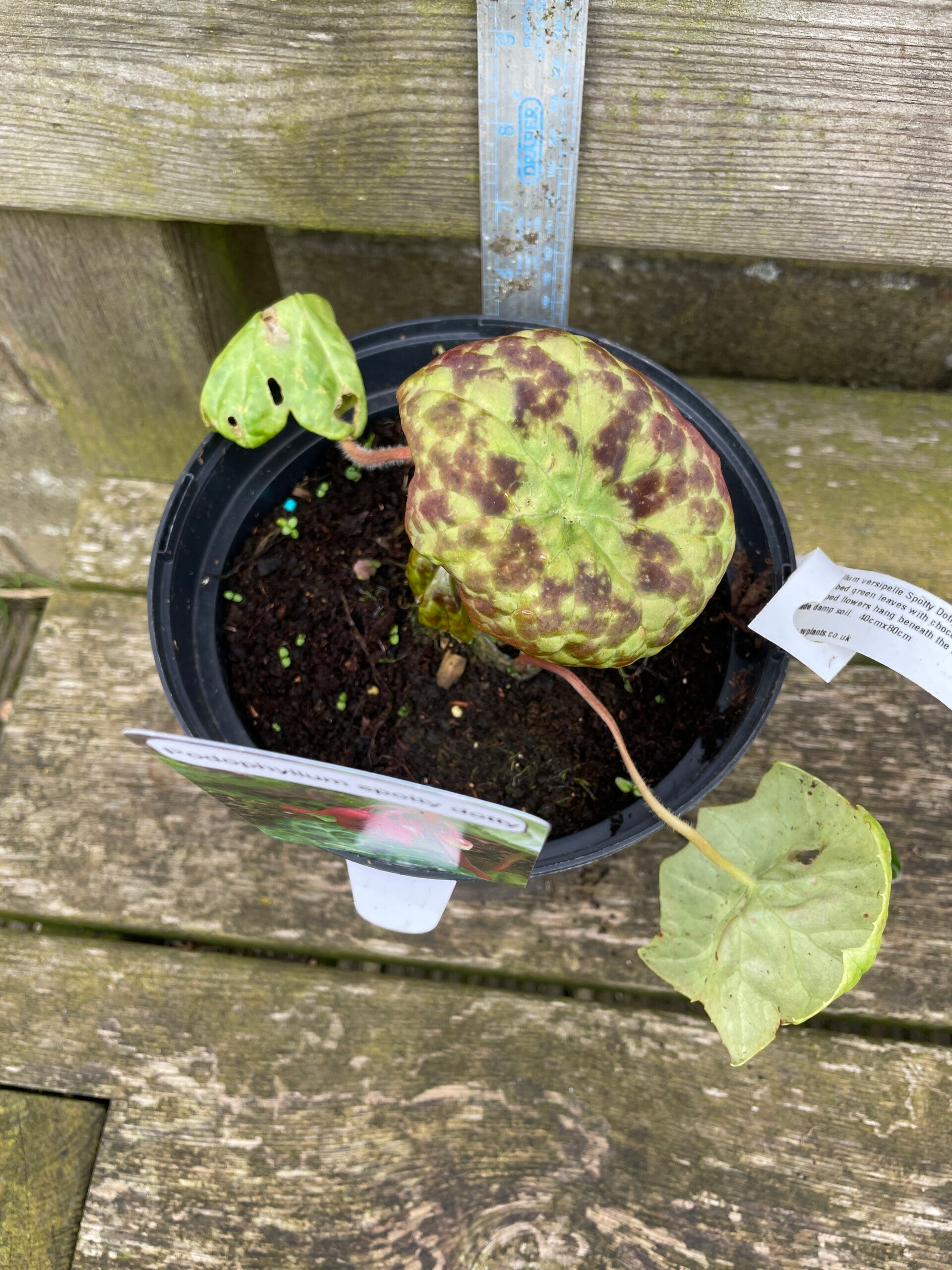 Podophyllum 'Spotty Dotty' is a striking, shade-loving, rhizomatous perennial known for its large, umbrella-like, deeply lobed leaves featuring dramatic, chocolate-brown spotting in spring. It produces clusters of dark, wine-red, cup-shaped flowers hanging beneath the foliage in late spring or early summer. Ideal for moist, humus-rich soil in partial to full shade, it grows 40–60cm tall.