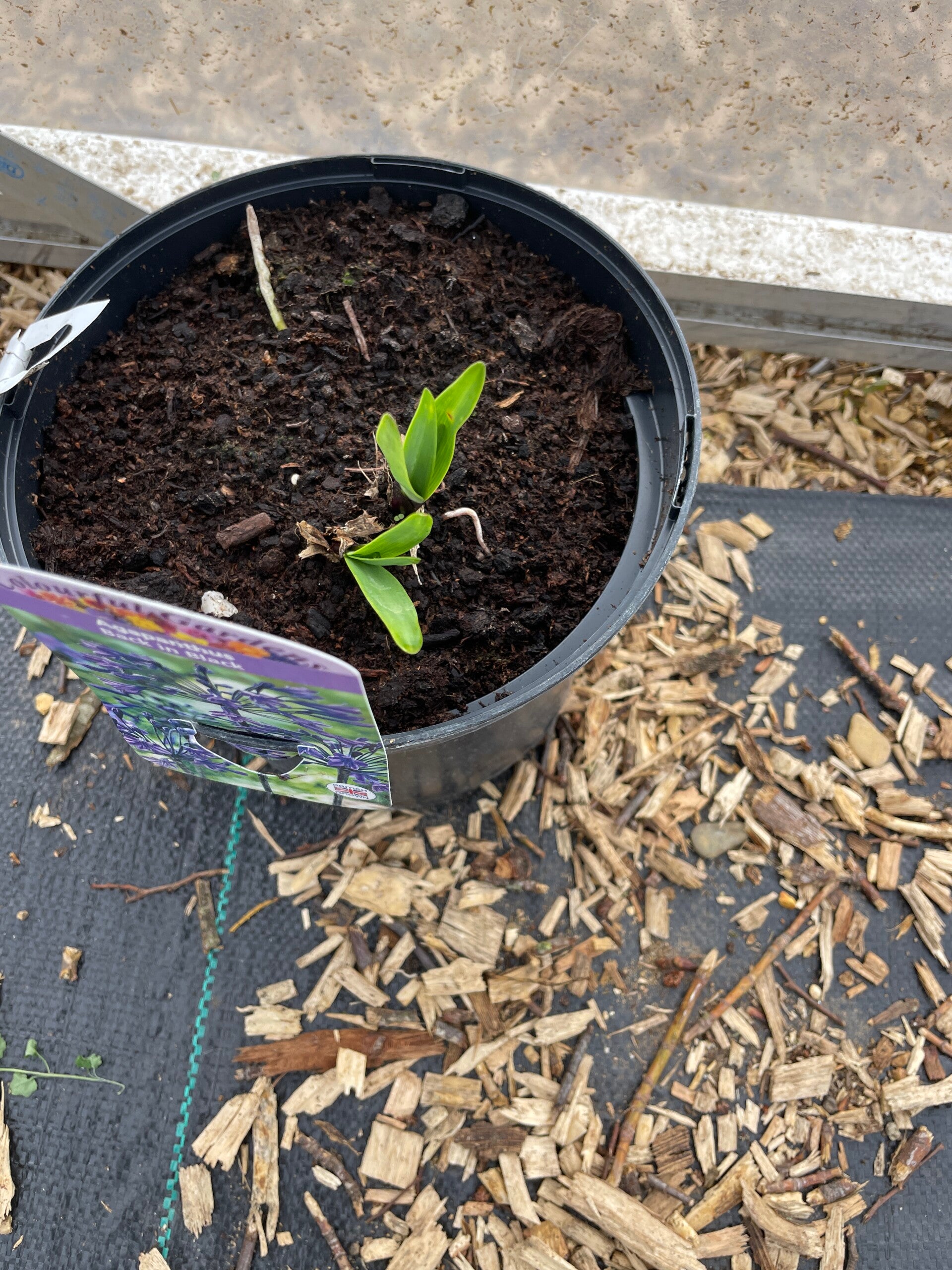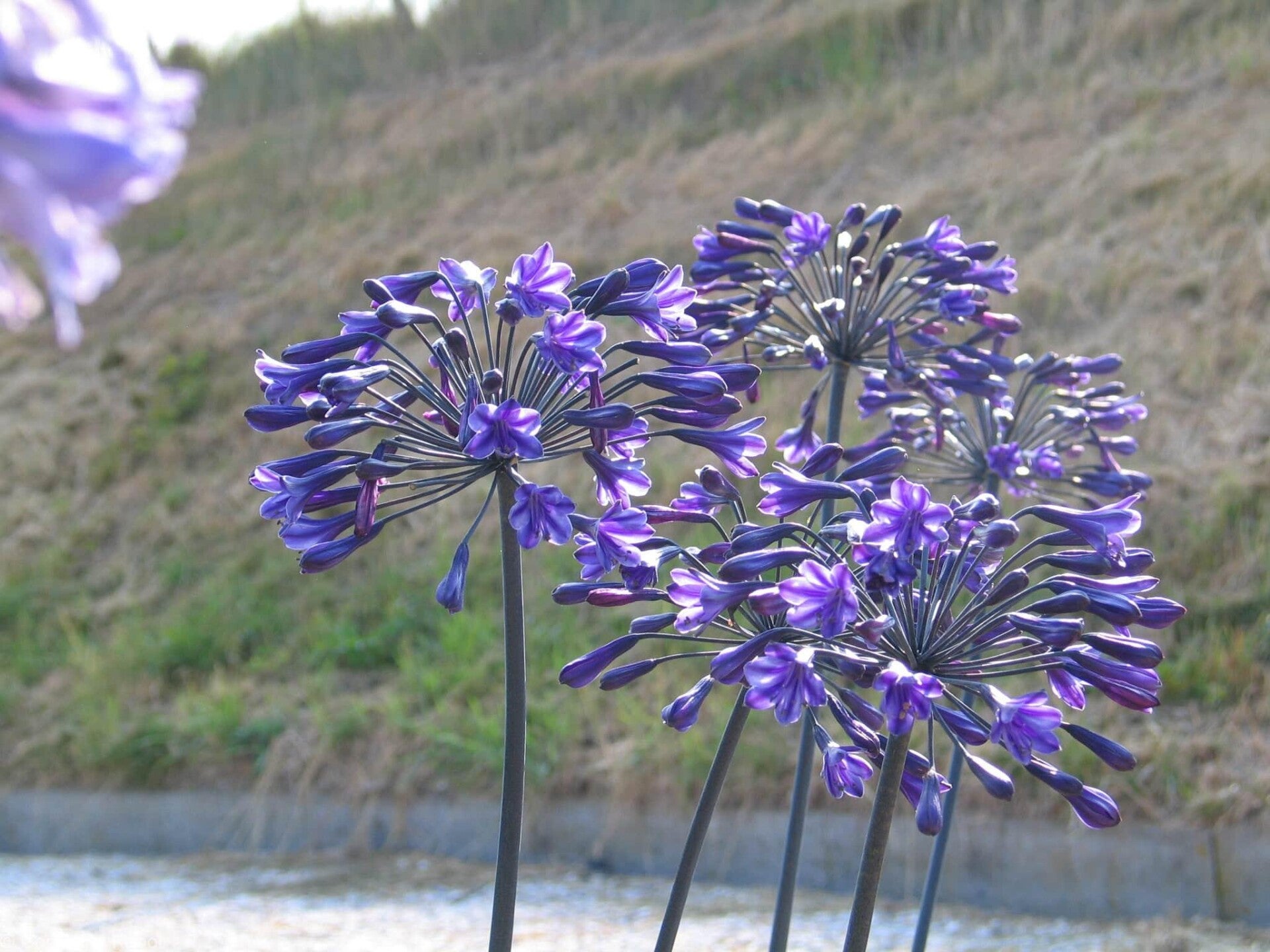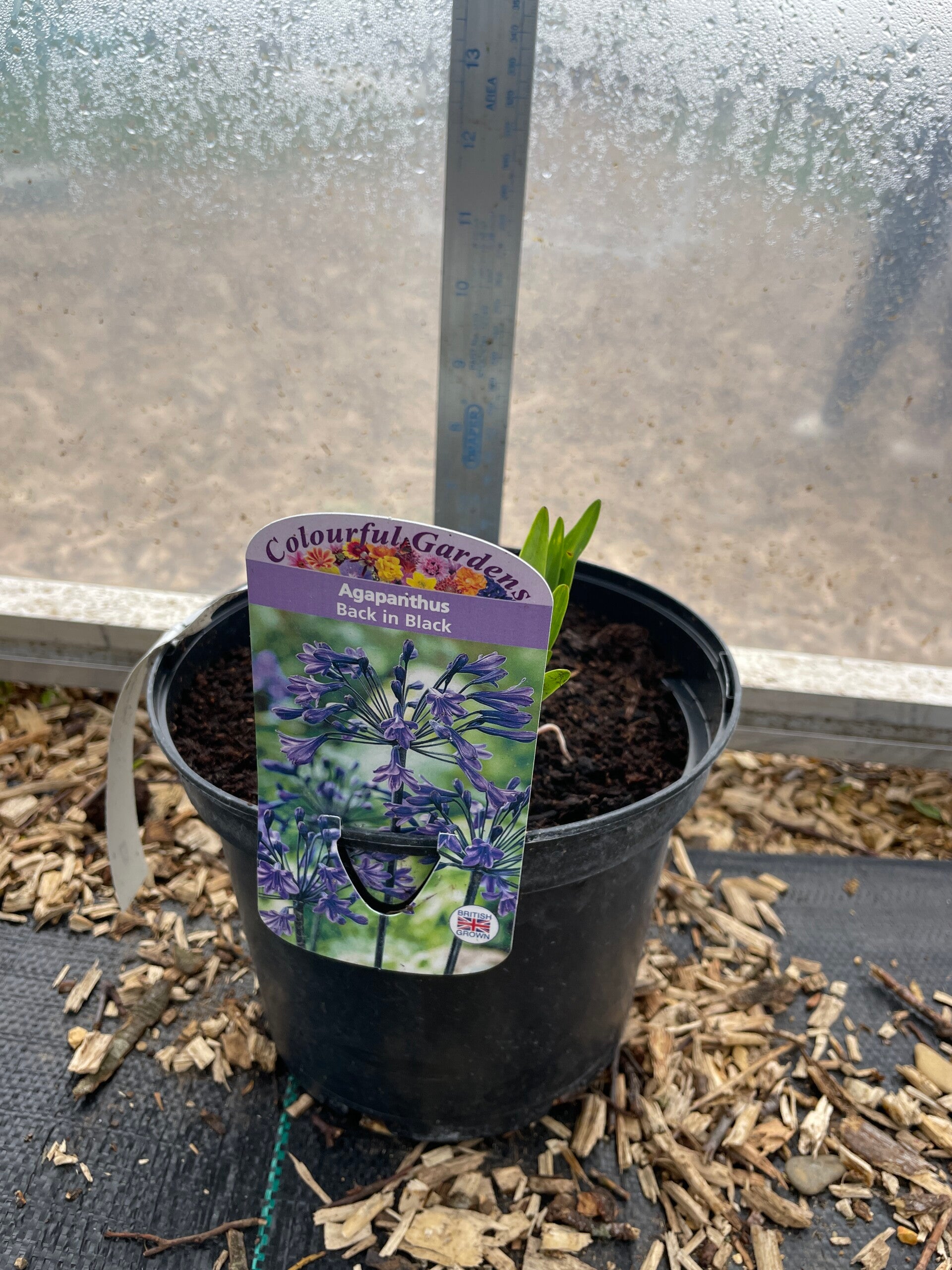 A clump-forming, evergreen herbaceous perennial with strap-like mid-green leaves and erect black stems bearing umbels of tubular, dark blue flowers with a central stripe on each petal in summer