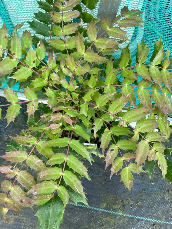 A compact evergreen shrub of upright growth to 3m tall, with long, spiny, pinnate dark green leaves. Flowers small, bright yellow, fragrant, in densely clustered arching racemes, followed by blue-black berries