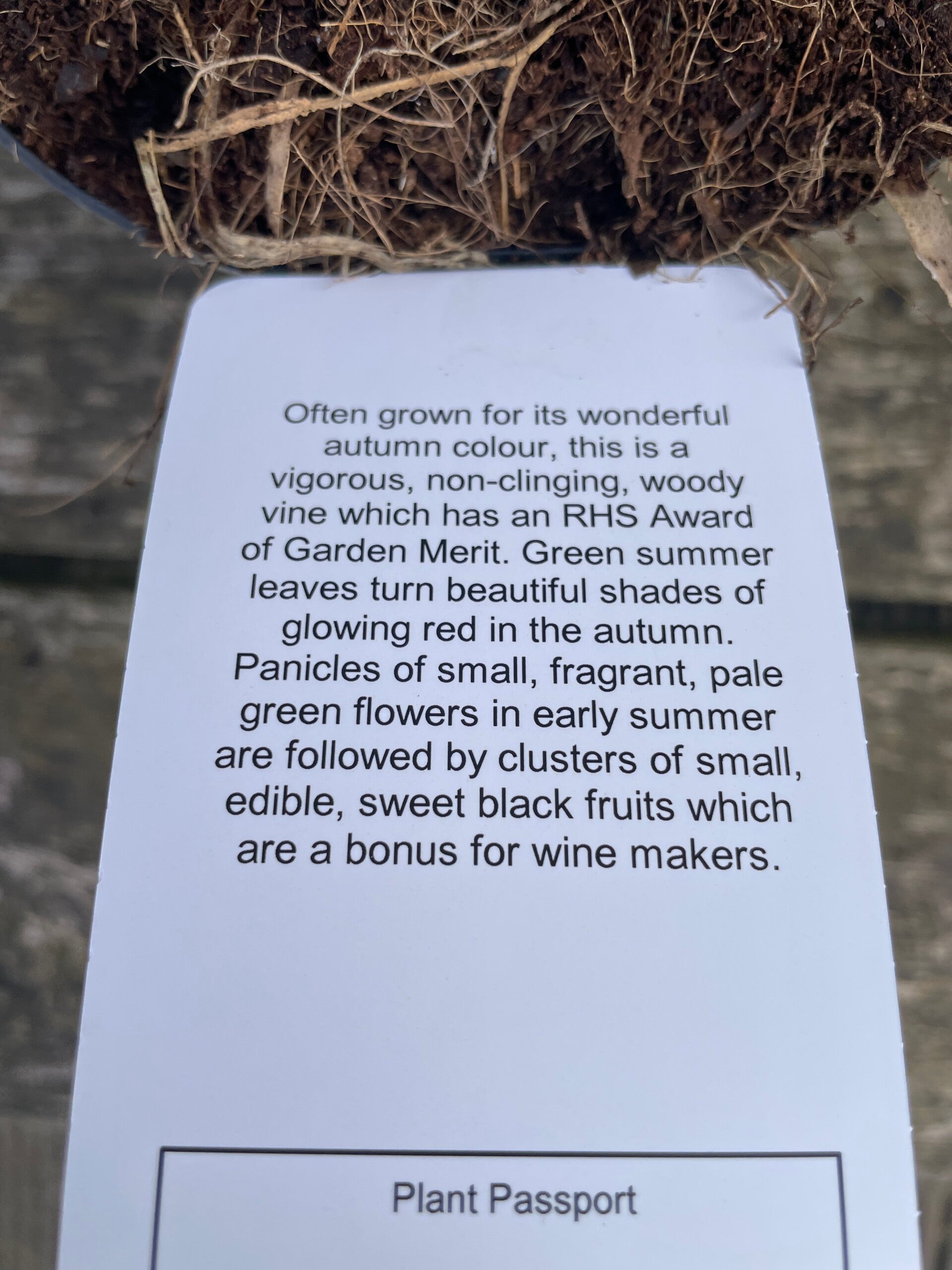 Often grown for its wonderful Autumn colour, this is a vigorou non-clinging, woody vine which has an RHS Award of Garden Merit. Green Summer leaves turn beautiful shades of glowing red in the Autumn. Panicles of small, fragrant pale green flowers in early Summer are followed by clusters of small, edible, sweet black fruits which are a bonus for wine makers.