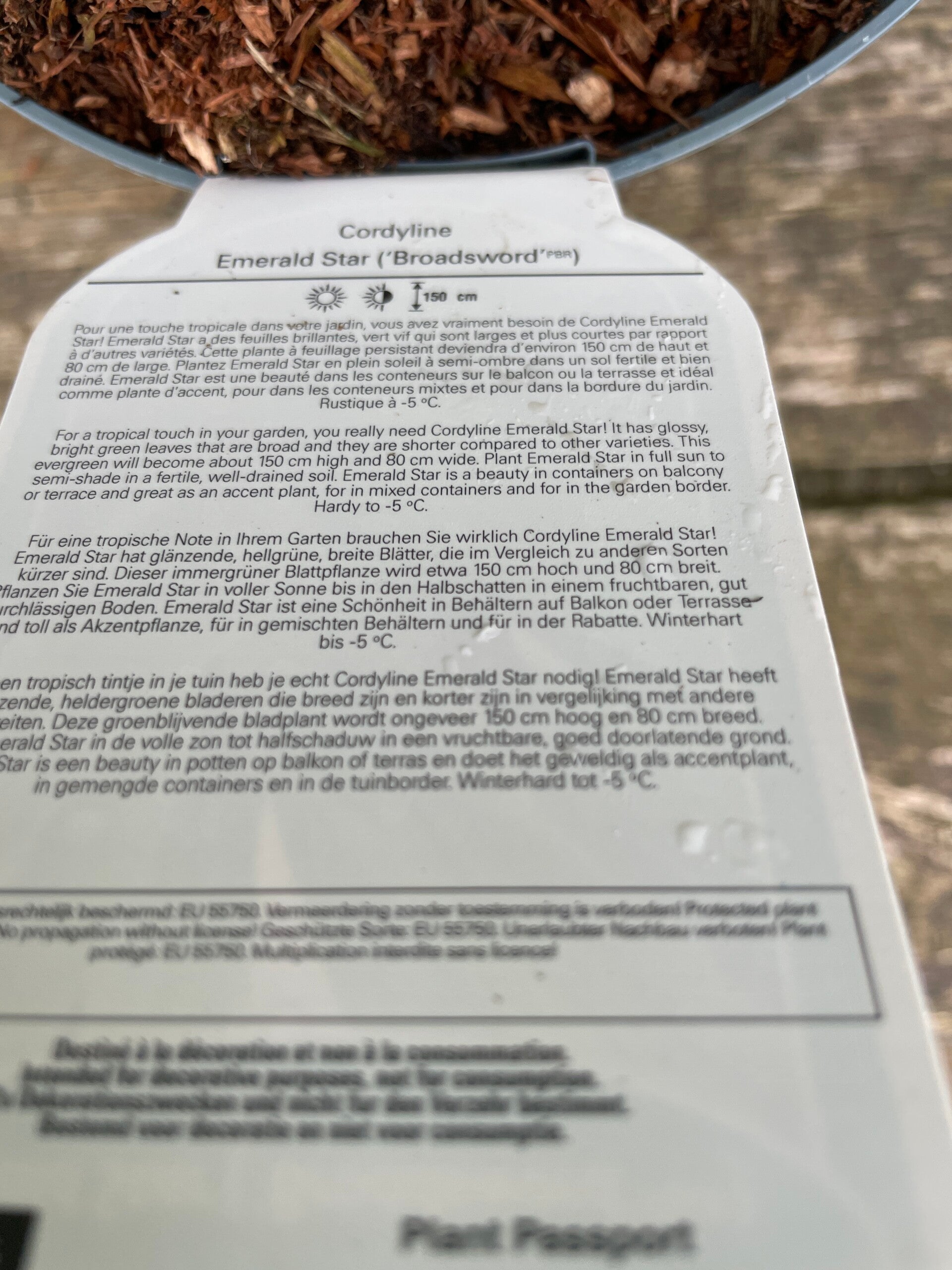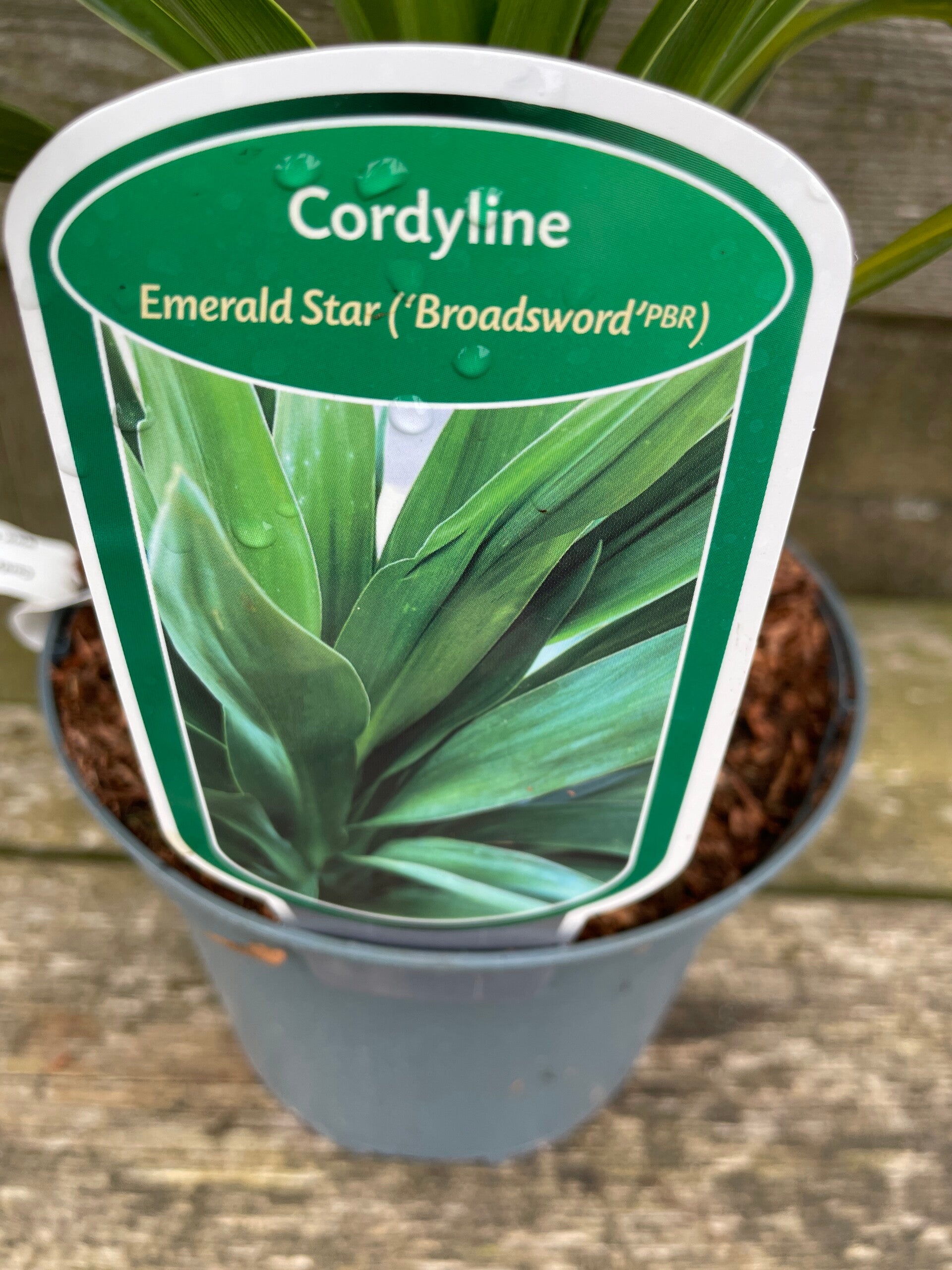 Cordyline 'Broadsword' (Emerald Star) is a compact, architectural evergreen shrub with glossy, vibrant green, sword-shaped leaves. Ideal for pots or small gardens, it grows to roughly 1.5–2m, is wind/salt tolerant, and hardy to  to . It thrives in full sun/part shade, requiring well-drained soil.
