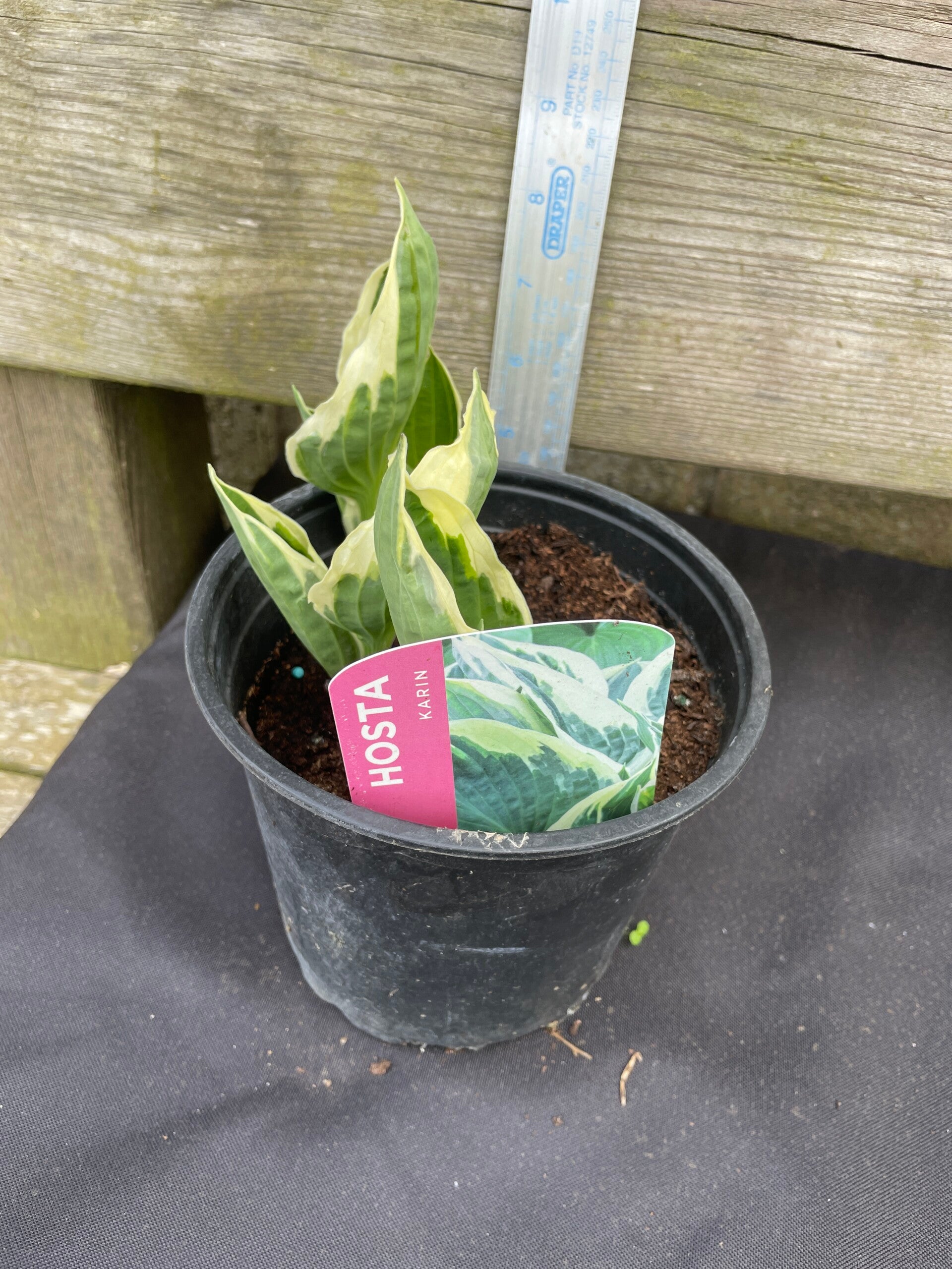 A compact, clump-forming, deciduous perennial with heart-shaped dark green leaves with variable cream margins. Upright stems of lavender-purple flowers appear in mid-summer